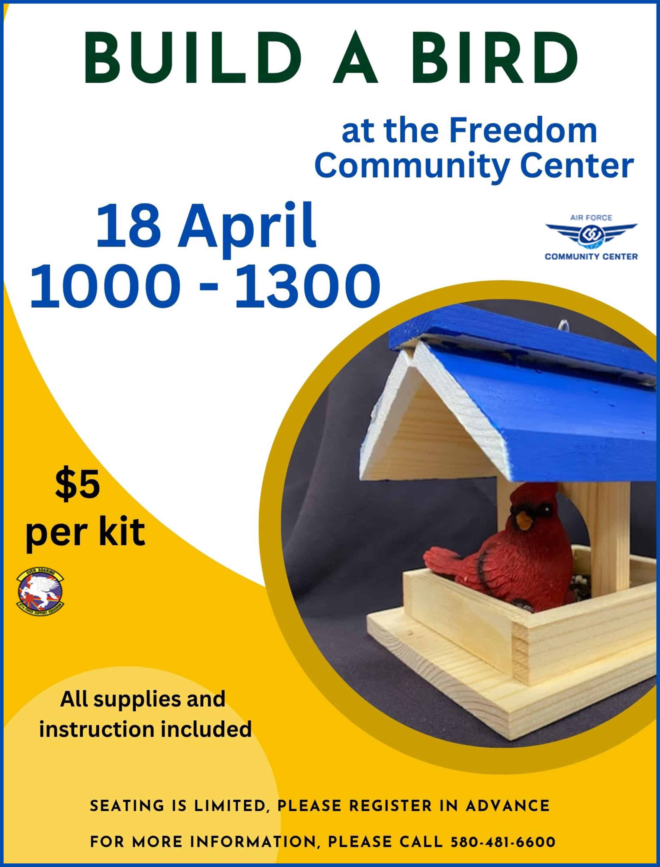 Join us at the Freedom Community Center for our Build a Bird workshop from 1000 to 1300! We will provide all the necessary supplies and instructions. Each kit costs $5. As seating is limited, we encourage you to register in advance. For more information, please call 580-481-6600.