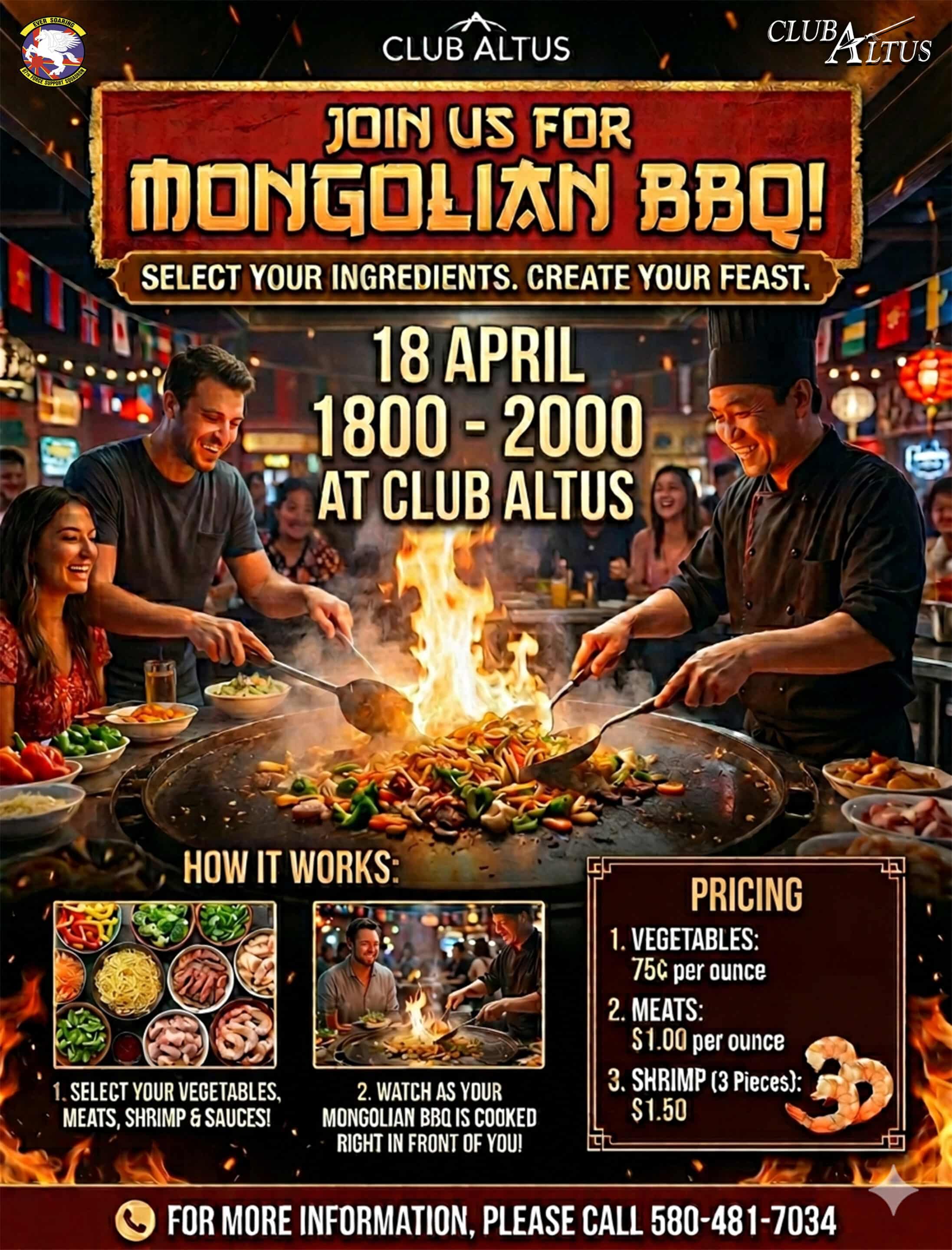 Come and have a wonderful night filled with Mongolian BBQ at Club Altus! Pick out your vegetables, meats, shrimp, and sauces, and enjoy watching your Mongolian BBQ being cooked right in front of you! If you need more information, just call 481-7034.