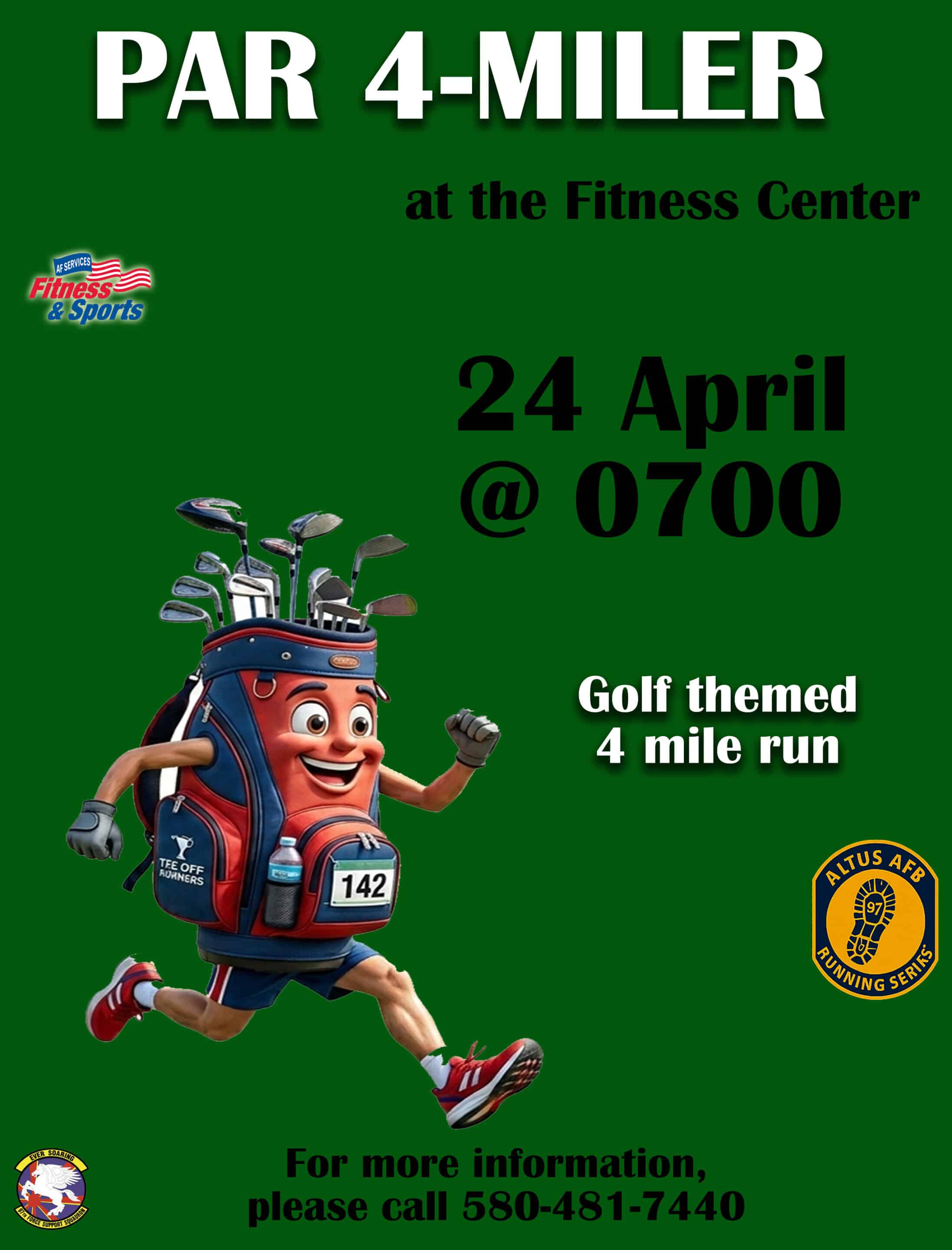 Tee off runners with this golf themed 4 mile run! Run starts at 0700 at the Fitness Center. For more information, please call 580-481-7440.