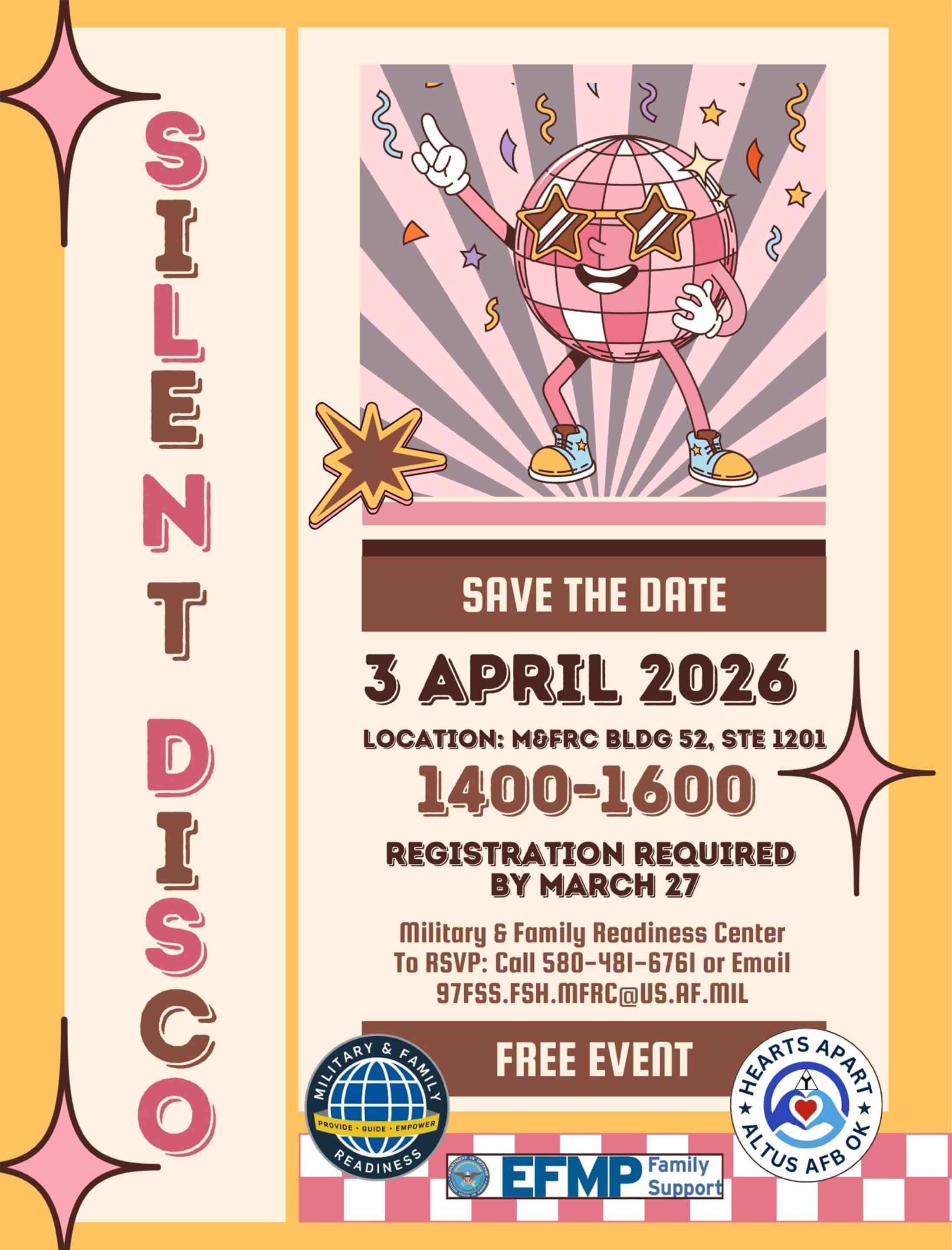 Silent Disco Party hosted by EFMP and Hearts Apart. For more information, please call 580-481-6761.